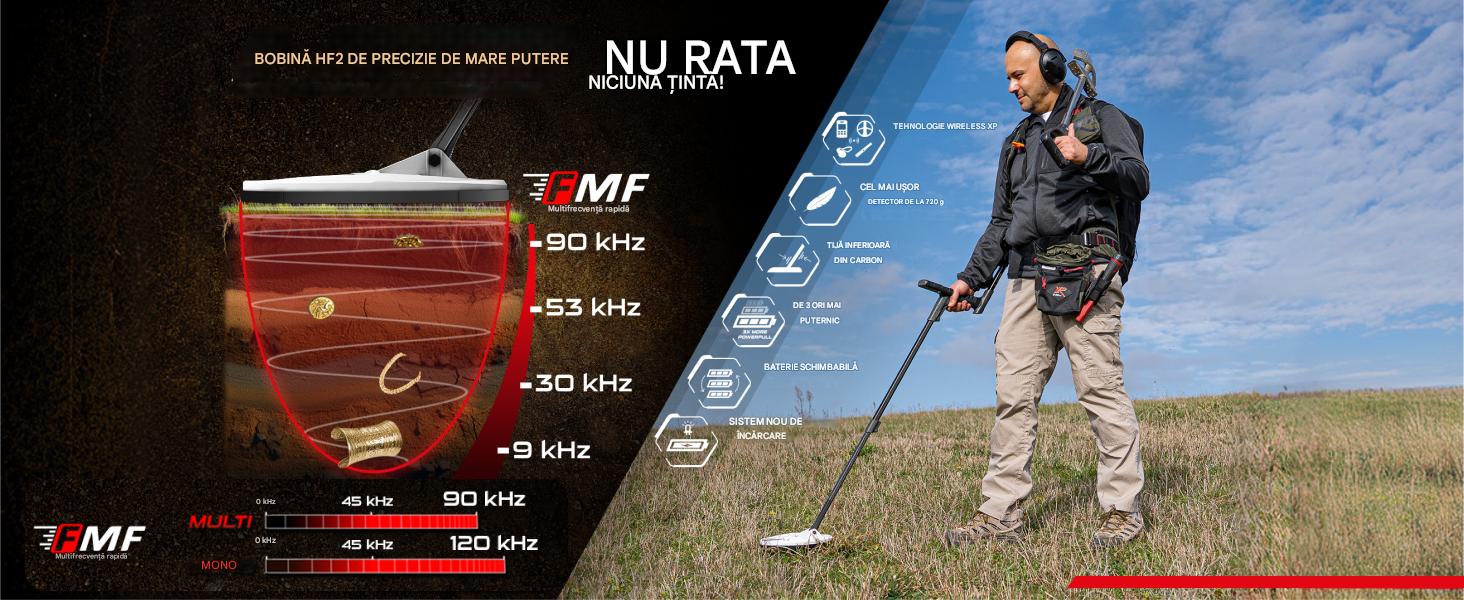 - Multi-frecvente: 9 - 90 kHz in modul FMF, 9 - 120 kHz in modul mono